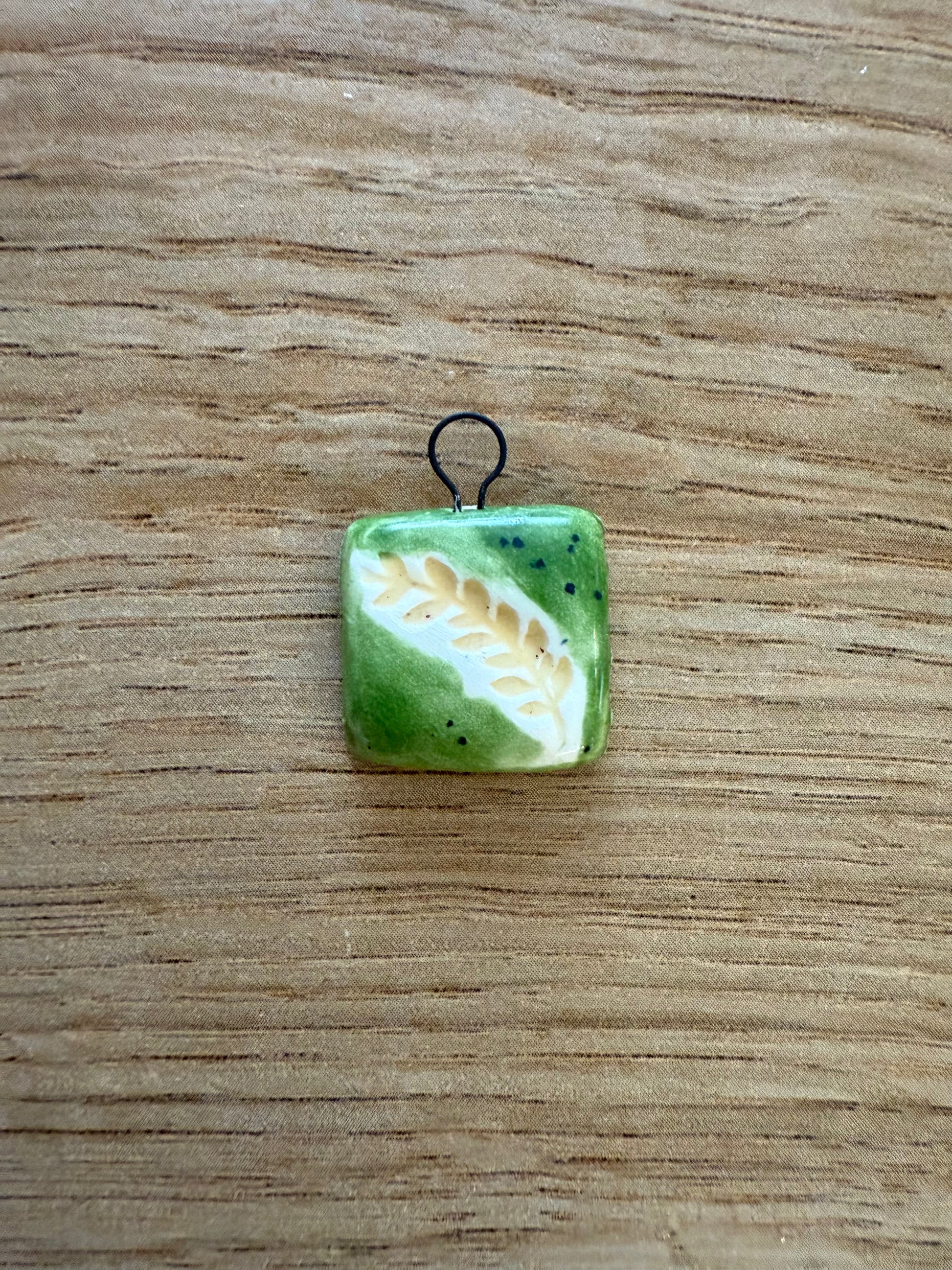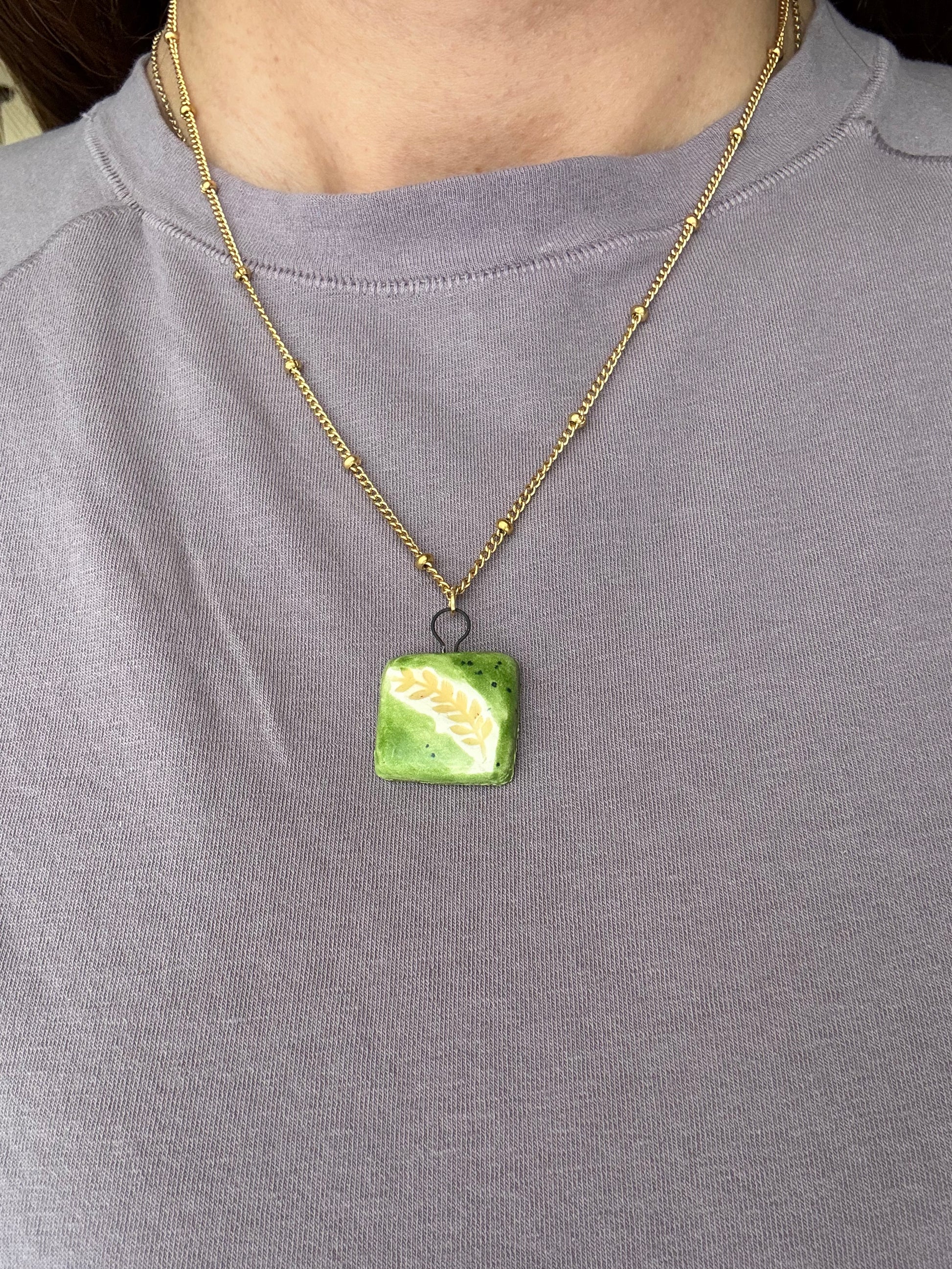 A handmade ceramic pendant of golden leaves surrounded by a green glaze. Adorn yourself with the golden leaves of the Cesar's! Maximus live forever! (16 Inch- 14K Gold Platted Chain.)